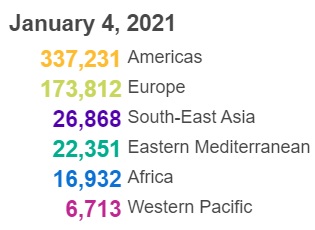根据世卫组织最新实时统计数据,截至欧洲中部时间1月4日17时33分(北京时间1月5日0时33分),全球累计新冠肺炎确诊病例83910386例,累计死亡病例1839660例。4日全球新冠肺炎确诊病例新增583907例,死亡病例新增7957例。