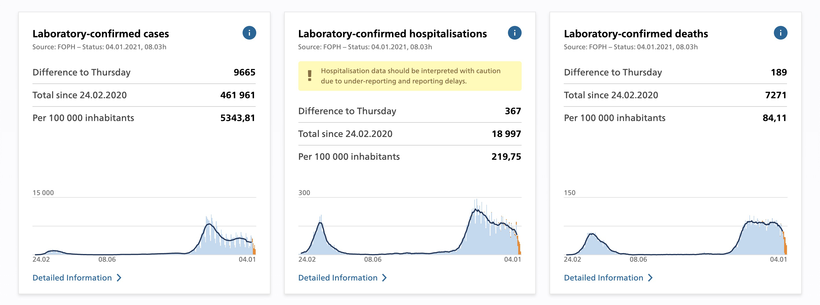 瑞士联邦卫生局最新数据显示,截至当地时间1月4日8时03分(北京时间1月4日15时03分),瑞士及列支敦士登公国新冠肺炎累计确诊病例461961例,相比2020年12月31日数据新增9665例(节假日暂停更新)。新增死亡189例,累计死亡7271例;新增住院治疗367人,累计住院治疗18997人。(总台记者 张婧昊)