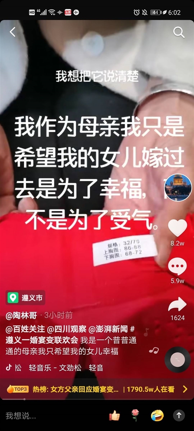 近日,贵州遵义市,新娘阳先生在婚礼前被新娘方拒绝发亲,理由是给新娘的内衣买小了。