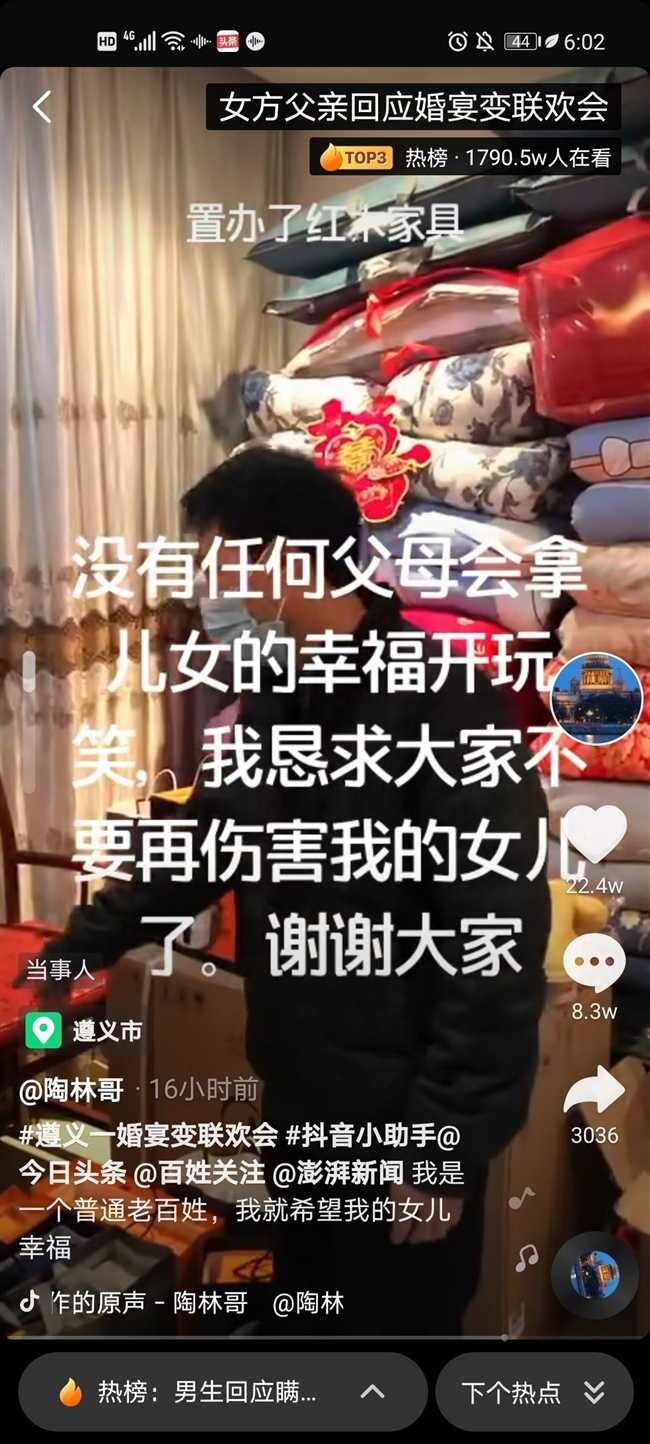 “这个寓意对农村人来说,就是不能包容我们家人,任何事情都没有让我们家人走进他们家的这种想法,是故意诋毁我们家人,希望大家在网络上不要攻击女儿了。”新娘母亲称。