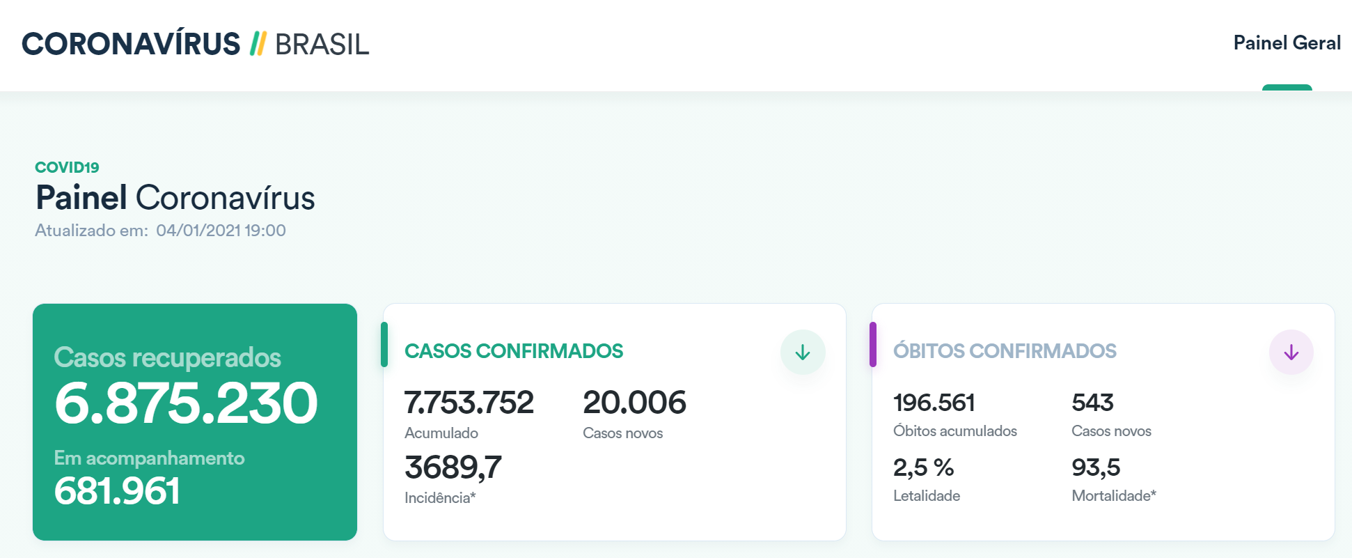 截至当地时间1月4日,巴西单日新增新冠肺炎确诊病例20006例,累计确诊7753752例,新增死亡病例543例,累计死亡196561例,累计治愈人数为6875230人。