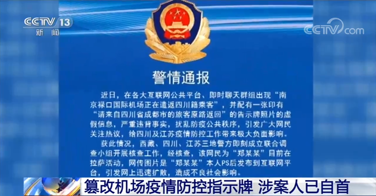 前不久,南京禄口国际机场的疫情防控指示牌遭人恶意篡改,原本是指引四川成都旅客登记的指示牌被改为了“请旅客原路返回”,图片在网络上引发了大量的关注。