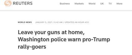 [环球网报道 记者 王芊润]“华盛顿警方警告参加支持特朗普的集会者,把枪留在家里,”英国路透社4日以此为题报道称,华盛顿市政府官员当地时间4日警告特朗普的支持者本周不要携带枪支参加(6日的)抗议活动。报道还提到,华盛顿已经召集300名美国国民警卫队成员帮助维持秩序。
