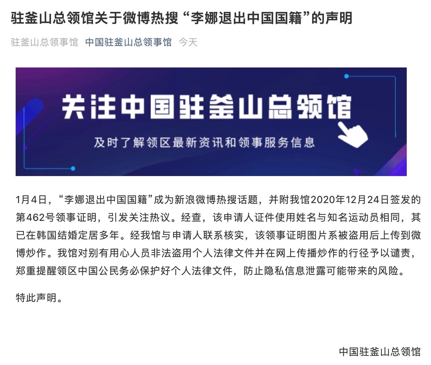 1月4日,中国驻韩国釜山总领馆发布声明称,关于新浪微博热搜话题“李娜退出中国国籍”一事,因相关传闻附有中国驻釜山总领馆出具的领事证明,领馆经调查,相关文件申请人系在韩定居多年人员,与知名运动员同名。该事件中领事证明系被盗用后上传到微博炒作,驻釜山领馆呼吁中国公民保护好个人法律文件,避免隐私泄露可能带来的风险。(总台记者 唐鑫)