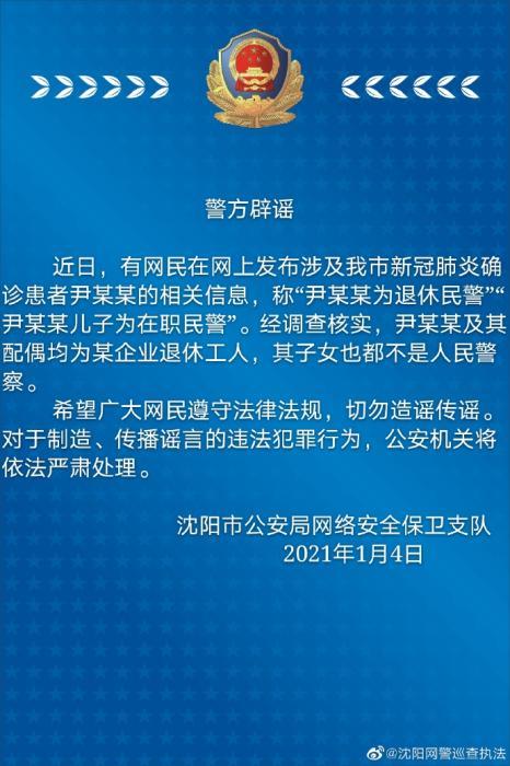 据沈阳市公安局网络安全保卫支队微博消息,近日,有网民在网上发布涉及沈阳市新冠肺炎确诊患者尹某某的相关信息,称“尹某某为退休民警”“尹某某儿子为在职民警”。经调查核实,尹某某及其配偶均为某企业退休工人,其子女也都不是人民警察。