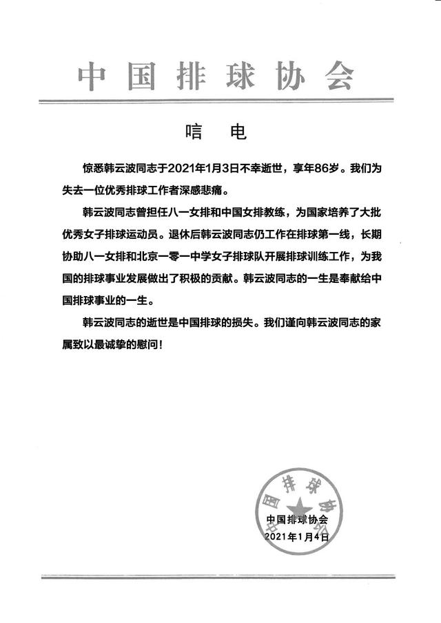 1月5日,中国排球协会发布唁电,前中国女排主帅韩云波于1月3日去世,享年86岁。中国排球协会表示:“韩云波同志曾担任八一女排和中国女排教练,为国家培养了大批优秀女子排球运动员。退休后韩云波同志仍工作在排球第一线,长期协助八一女排和北京一零一中学女子排球队开战排球训练工作,为我国的排球事业发展做出了积极的贡献。韩云波同志的一生是奉献给中国排球事业的一生。”韩老,一路走好!
