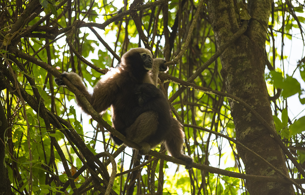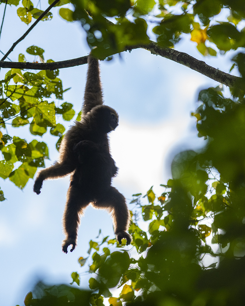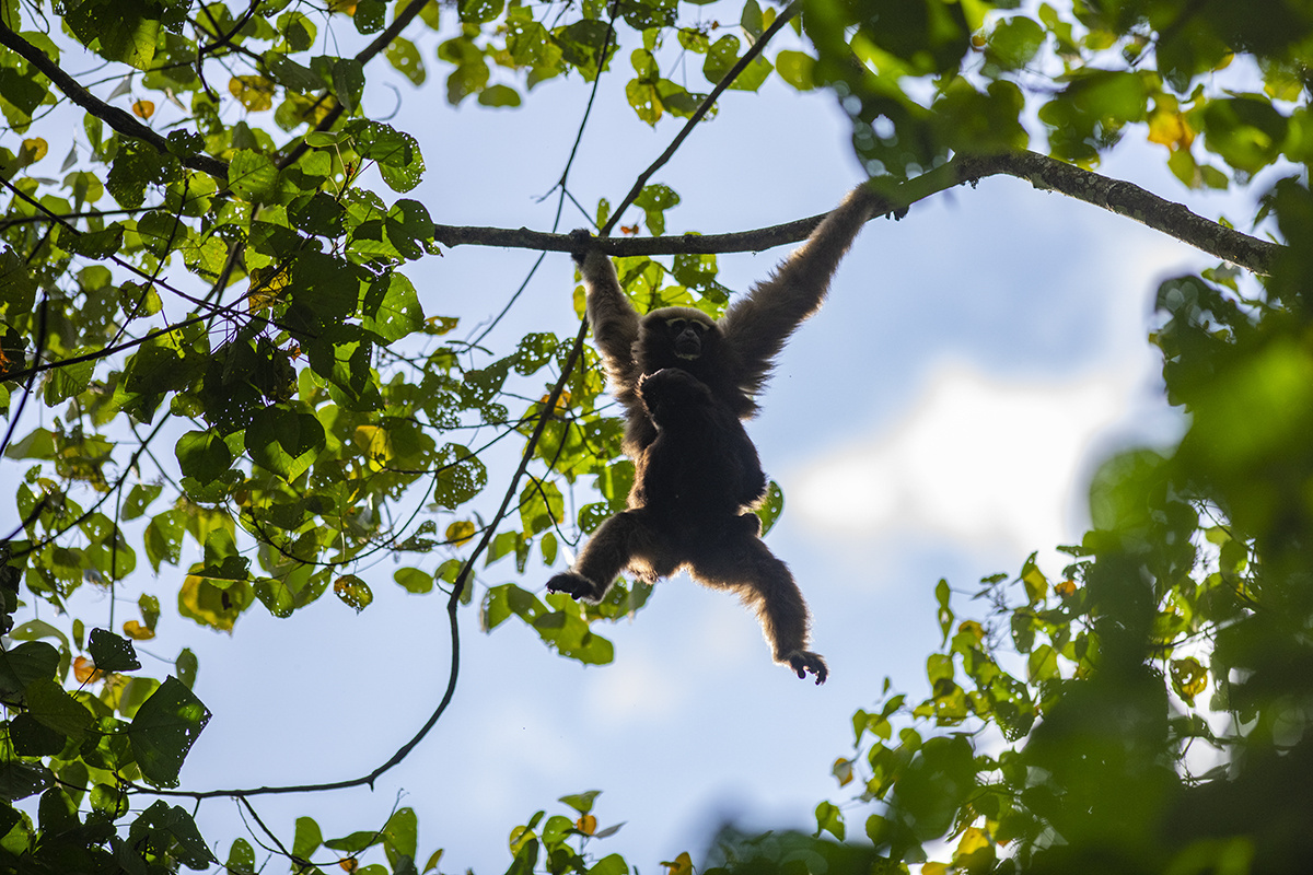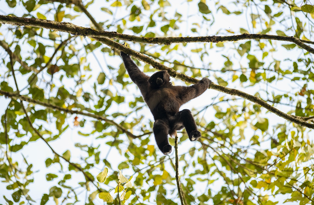 天行长臂猿是为世界濒危、中国国家一级重点保护野生动物,是唯一一种中国科学家命名的类人猿。仅在我国和缅北地区有分布,其在我国境内的分布区域十分狭窄、种群数量极其稀少,主要分布在德宏州盈江县大娘山片区和高黎贡山部分区域,国内种群数量不足150只,盈江区域分布有84只左右。据零碎的资料综合分析,天行长臂猿在缅北的境况并不乐观。