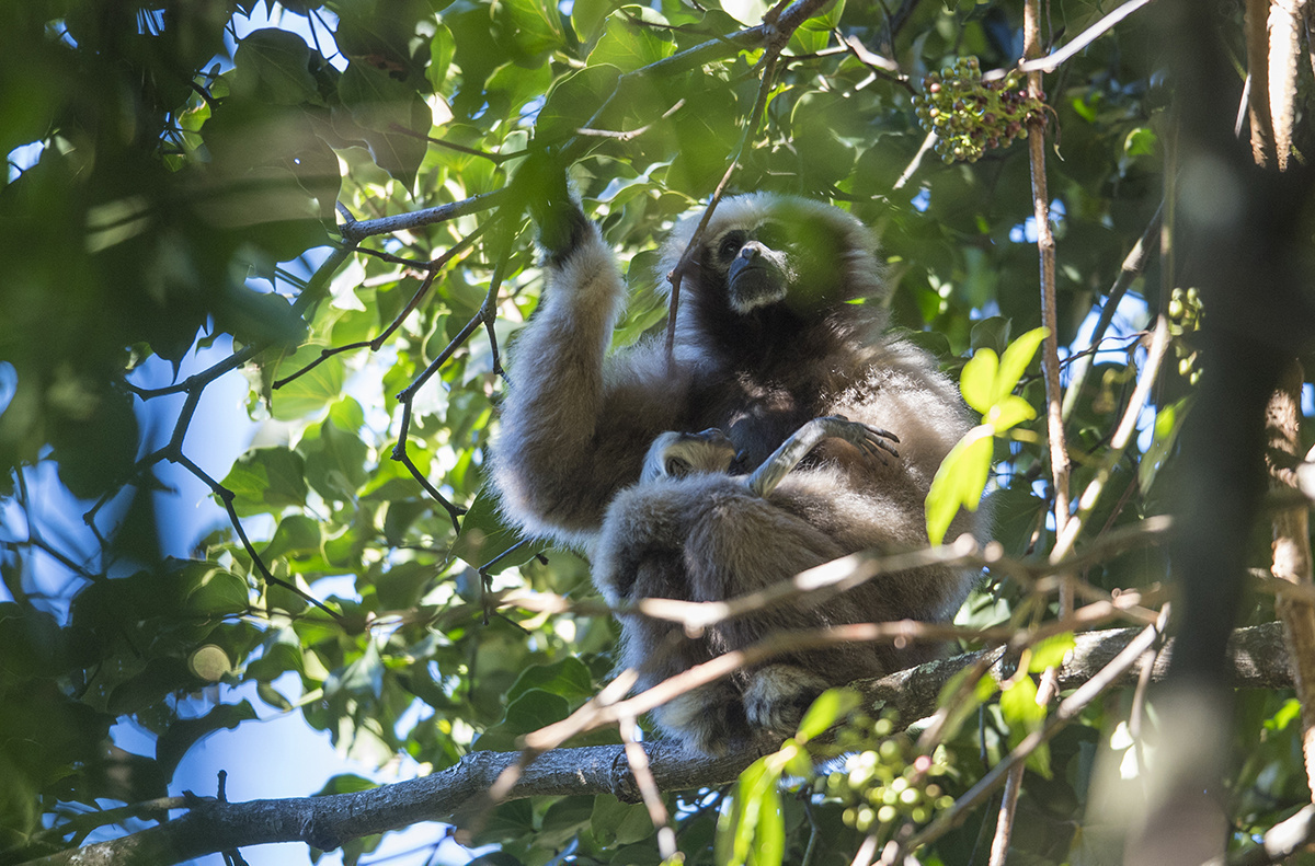 2020年12月底,一群摄影家在盈江县支那乡香柏村拍摄“全国最大长臂猿家庭”时,拍到了2年前还依偎在妈妈怀抱里的乳白色小天行长臂猿,已经开始试着离开妈妈的怀抱自己觅食、玩耍的珍贵画面,这只小家伙满2岁了。现今,它的毛色已经变成了黑色,从毛色上可以判定它是一个非常帅气的“小伙儿”。当妈妈享受着日光浴的时候,它会顽皮地离开妈妈的怀抱,到附近觅食、玩耍。