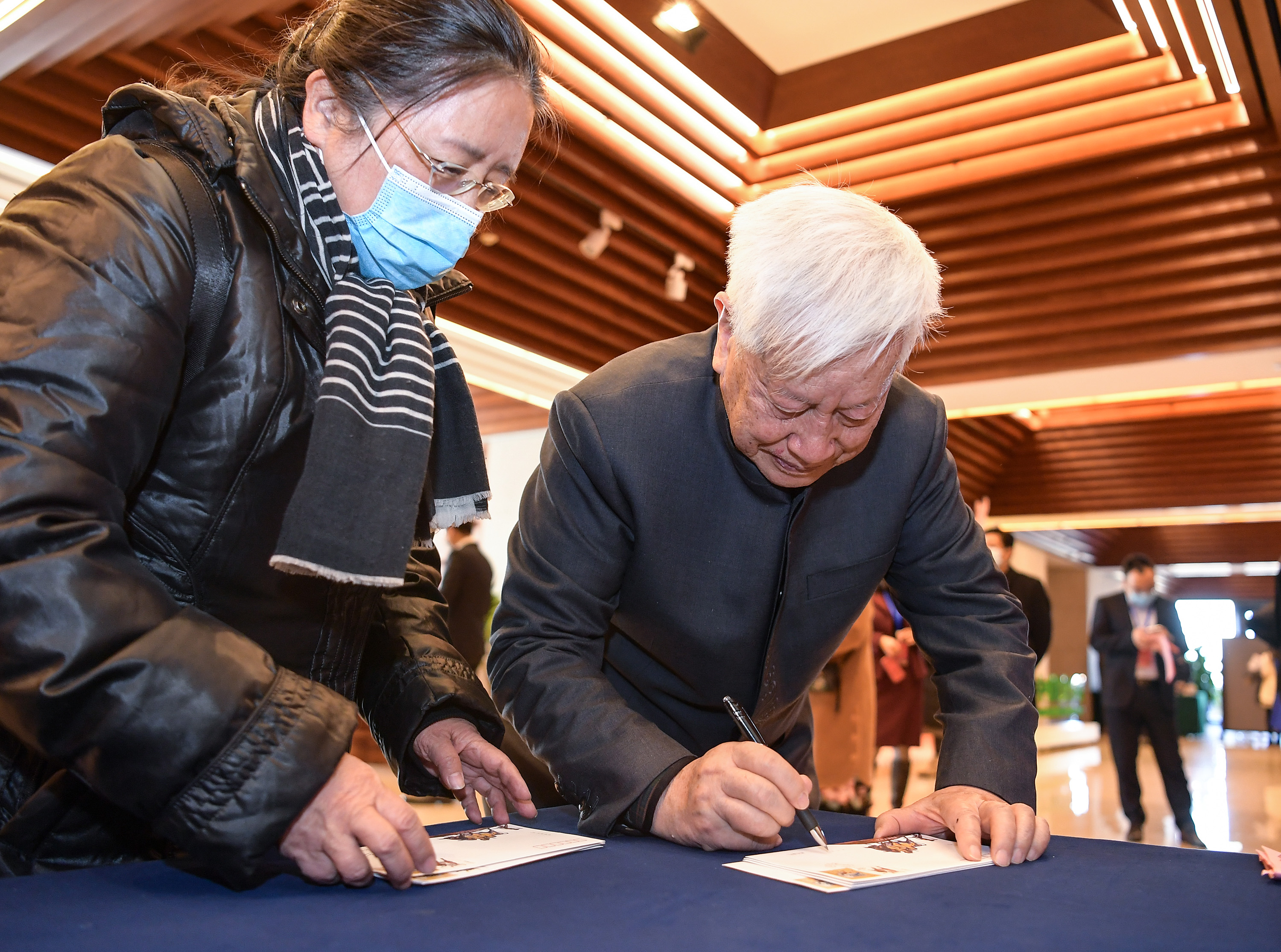 1月5日,《辛丑年》特种邮票设计者、艺术家姚钟华(右)在北京的首发仪式现场为集邮爱好者的《辛丑年》特种邮票首日封签名。