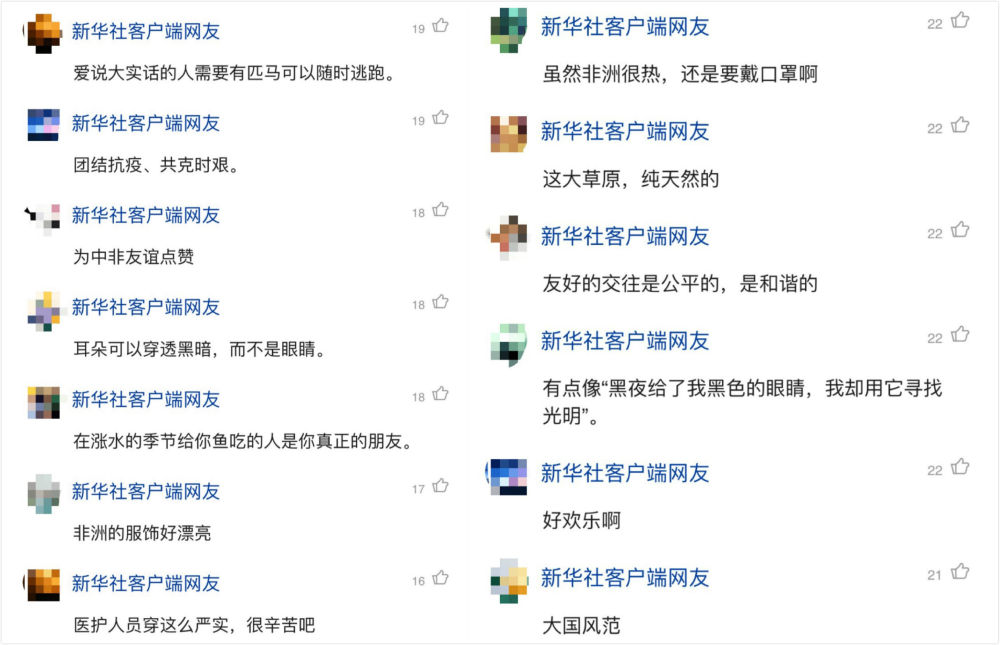 有些网友看到援非医疗队队员的严密防护,体谅医护人员的辛苦;有些人感慨,“非洲是人类的摇篮,拥有充满智慧的谚语,值得学习”,有些人畅想“去非洲的大草原奔跑”,还有网友提议“要不要来个谚语接龙”。
