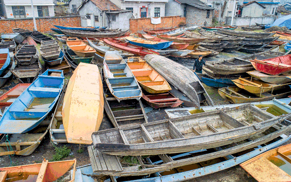 ▲2020年1月2日拍摄的湖北省宜都市枝城镇白水港村一处“上岸”的渔船堆放点(无人机照片)。新华社资料图片