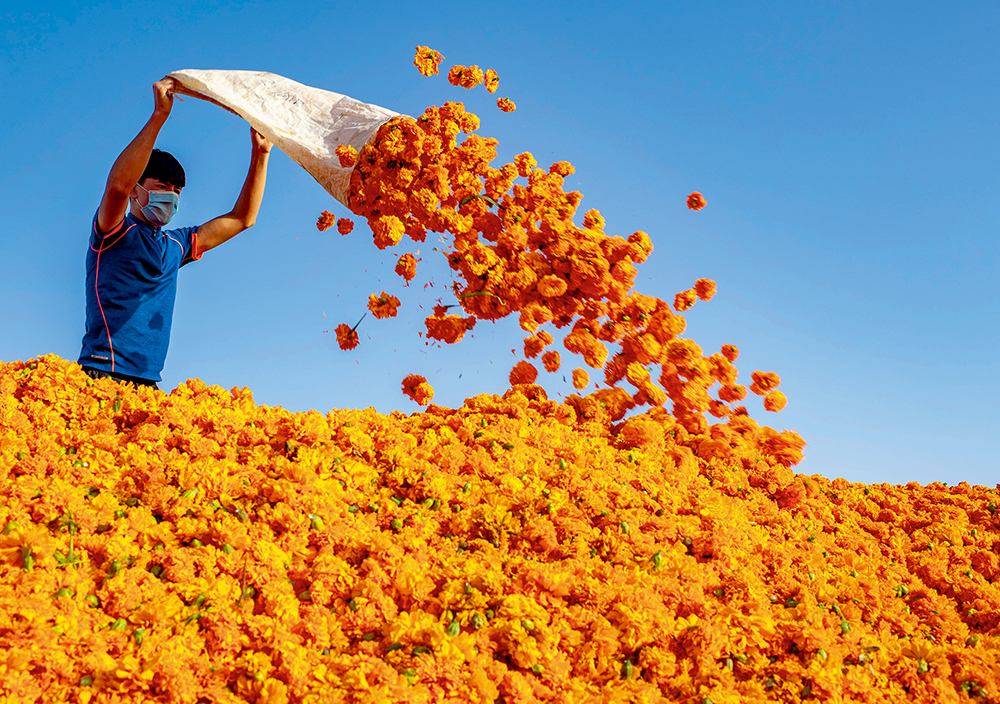 新疆于田县的村民将称重后的万寿菊倒入发酵池(2020年9月20日摄) 胡虎虎摄/本刊
