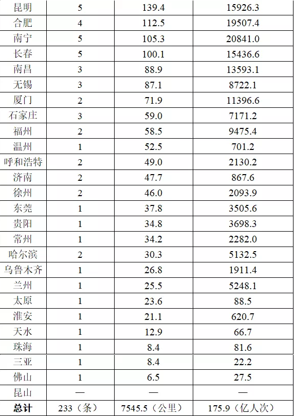 △图为城市运营里程由大到小排序,其中昆山市5.96公里地铁线路为上海地铁11号线延伸线,纳入上海市统计范围;广佛线(佛山段)纳入广州市统计范围。