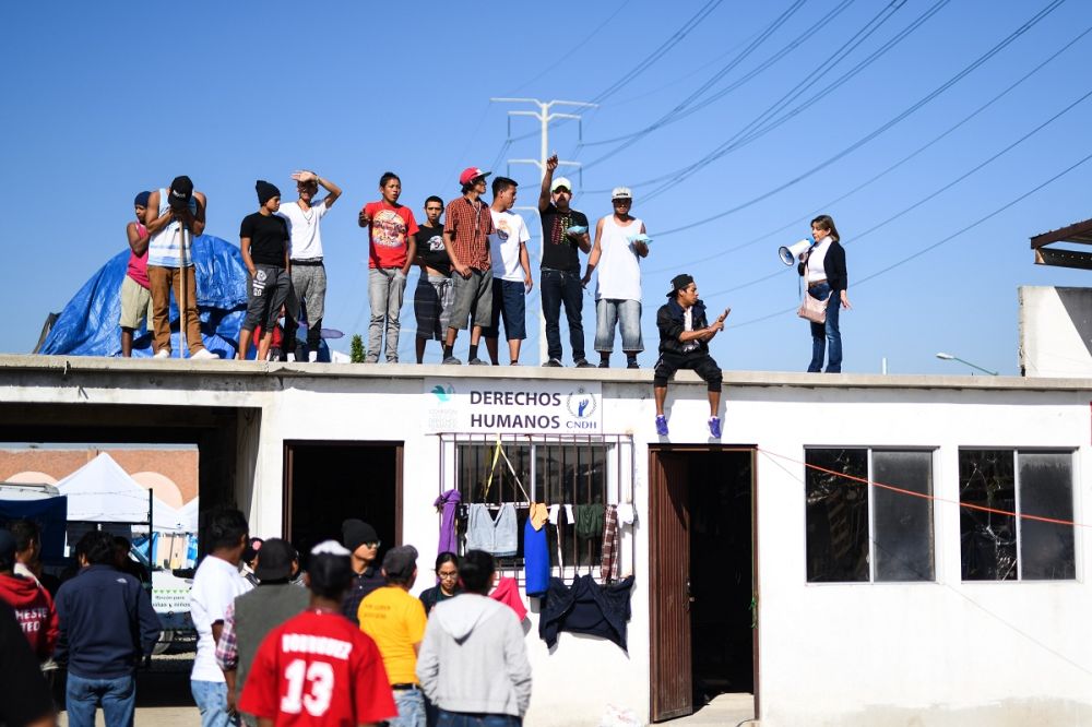 2019年1月9日,在墨西哥边境城市蒂华纳,来自中美洲的移民在临时住所里与工作人员(右)交涉。(新华社记者辛悦卫摄)