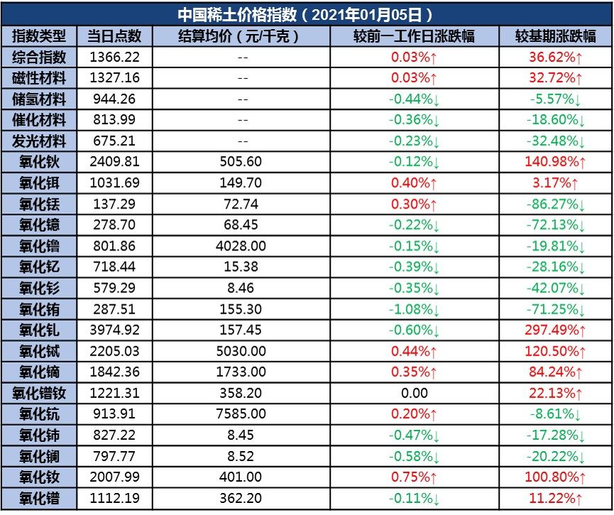新华财经北京1月5日电(刘星麟)5日,中国稀土价格指数报1366.22点,较前一工作日上涨0.36点,涨幅为0.03%。镝铽氧化物价格上涨,上游厂商报价坚挺,市场货源有限支撑价格走高。