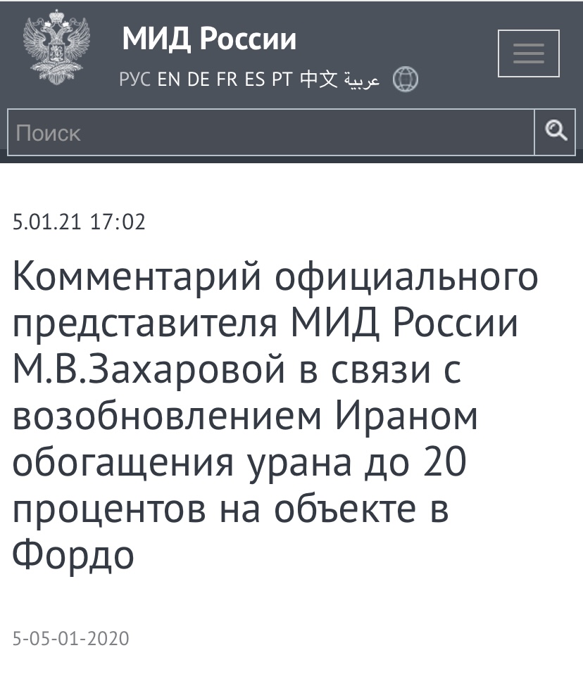 当地时间1月5日,俄罗斯外交部发布声明,对伊朗浓缩铀丰度超过20%进行评论。