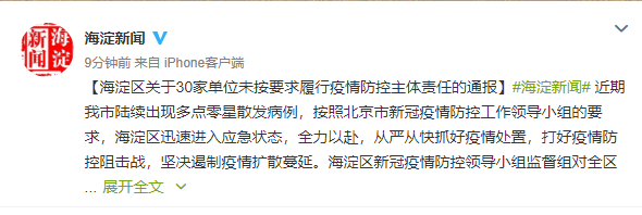 近期北京市陆续出现多点零星散发病例,按照北京市新冠疫情防控工作领导小组的要求,海淀区迅速进入应急状态,全力以赴,从严从快抓好疫情处置,打好疫情防控阻击战,坚决遏制疫情扩散蔓延。海淀区新冠疫情防控领导小组监督组对全区各有关单位疫情防控工作进行了监督检查,发现一些防控责任不落实、防控措施不到位的典型问题,现将有关情况通报如下: