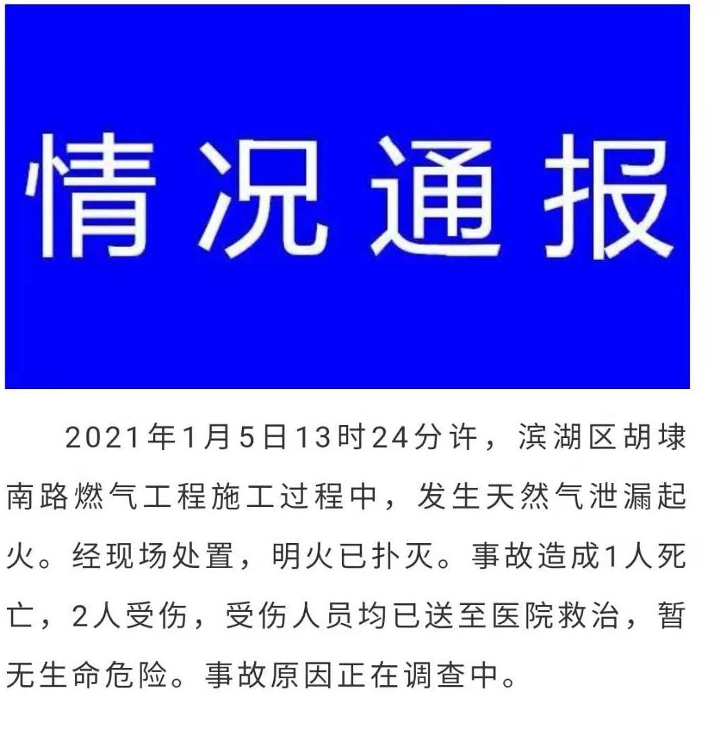1月5日13时24分许,江苏无锡滨湖区胡埭南路燃气工程施工过程中,发生天然气泄漏起火。事故造成1人死亡,2人受伤,受伤人员均已送至医院救治,暂无生命危险。事故原因正在调查中。