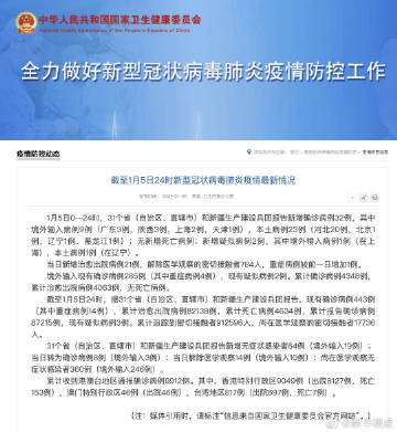 截至1月5日24时,据31个省(自治区、直辖市)和新疆生产建设兵团报告,现有确诊病例443例(其中重症病例14例),累计治愈出院病例82138例,累计死亡病例4634例,累计报告确诊病例87215例,现有疑似病例3例。累计追踪到密切接触者912596人,尚在医学观察的密切接触者17736人。