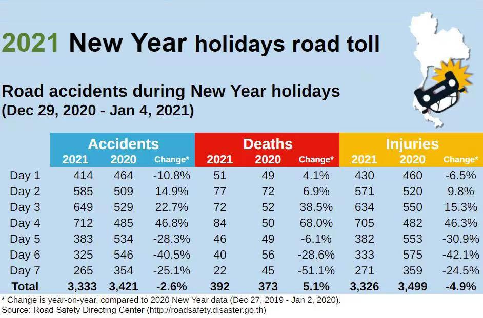当地时间1月5日,泰国内政部简报透露,2020年12月29日至2021年1月4日新年7天长假期间,泰国发生3300多起交通事故,造成3326人受伤,392人死亡,死亡人数比去年同期增长了5%。超速驾驶是发生事故的主要原因,占33.6%,其次是酒后驾驶,占33.1%。(总台记者 陈林聪)