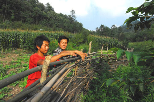 陕西省佛坪县三官庙村村民张安新(右)与家人一起修补“防猪篱笆”(资料图片)。新华社发(梁启慧摄)