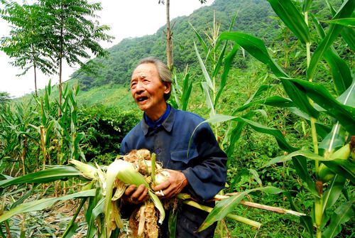 陕西省佛坪县三官庙村村民赵仁勋拿着被野猪毁了的玉米棒子一脸无奈(资料图片)。新华社发(梁启慧摄)