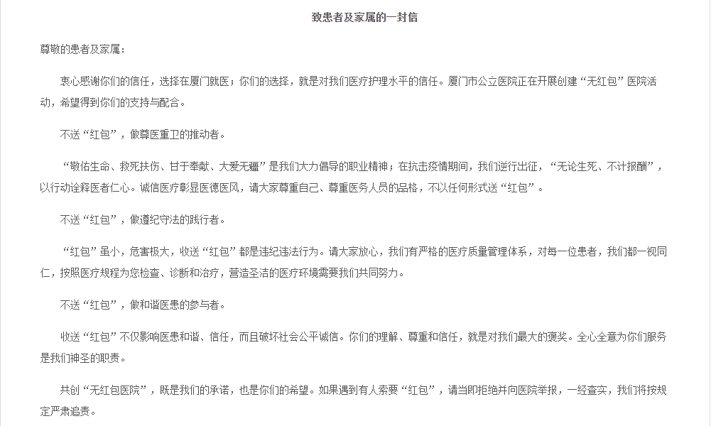 目前,各医院表示,将切实履行好创建“无红包医院”的主体责任,严格要求广大医务人员切实履行不收“红包”的郑重承诺;同时,厦门市纪委监委驻市卫健委纪检监察组也发布了致患者及家属的一封信,倡议广大患者,不以任何形式送“红包”,共同营造风清气正的医疗环境。
