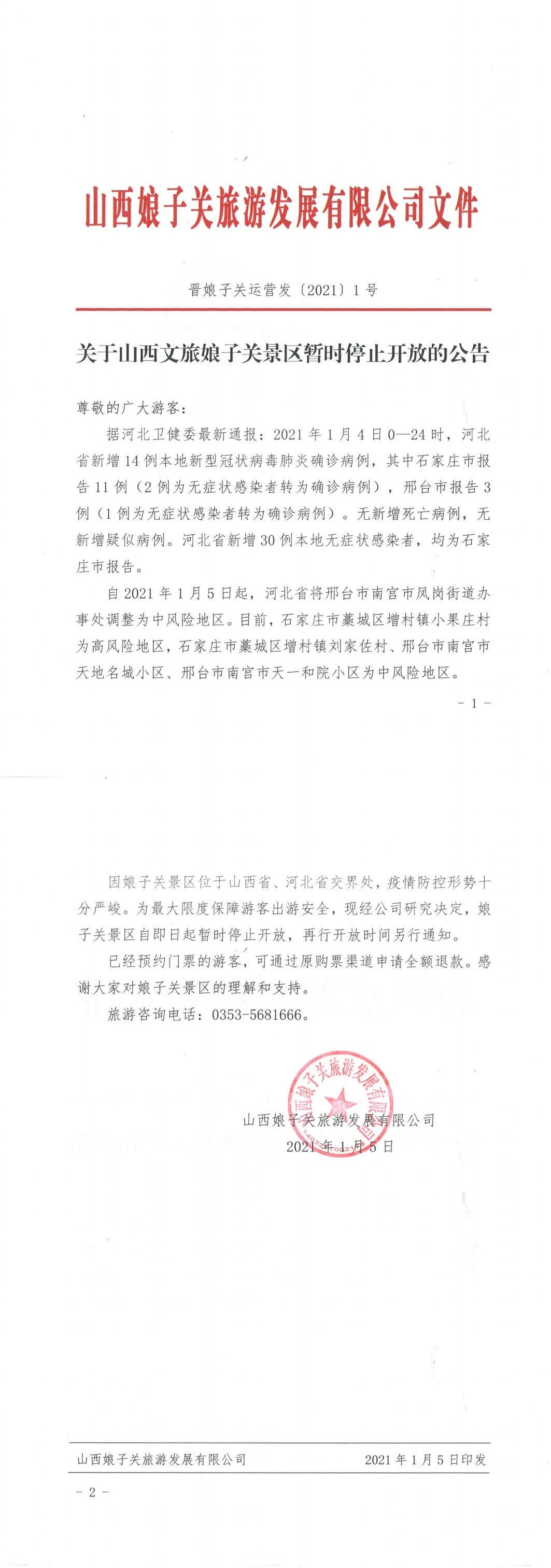 记者从山西娘子关旅游发展有限公司了解到,因娘子关景区位于山西省、河北省交界处,疫情防控形势十分严峻。为最大限度保障游客出游安全,娘子关景区自1月5日起暂时停止开放,再行开放时间另行通知。已经预约门票的游客,可通过原购票渠道申请全额退款。