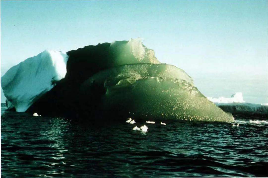 冰山不只有蓝色和白色,还有绿色。绿色冰山是南极特有的非常少见的冰山,据说平均每1000 座冰山中只有一座绿色冰山。这种冰山远远看去一片翠绿,在由蓝白两色“统治”的南极海域中显得异常神秘。长久以来,绿色冰山一直让人感到匪夷所思。科学家猜测,这有可能是氧化铁把普通的蓝色冰变成了绿色冰。