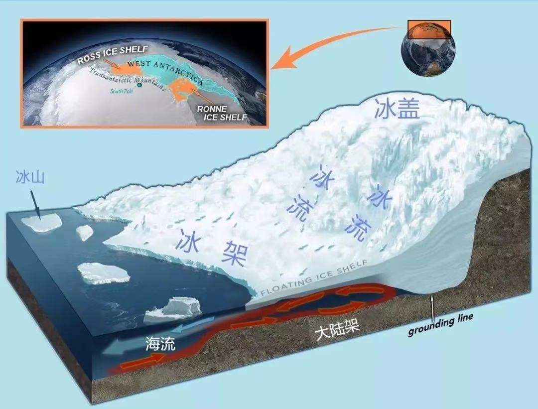 晶莹剔透的雪花在其自身压力下渐渐变成密实的冰体,最终连成广袤的冰川或冰盖。在重力作用下,冰川缓慢地向大陆边缘“流动”,伸入四周的大海。冰川伸向海面的部分被称为冰架,冰架断裂则形成冰山。