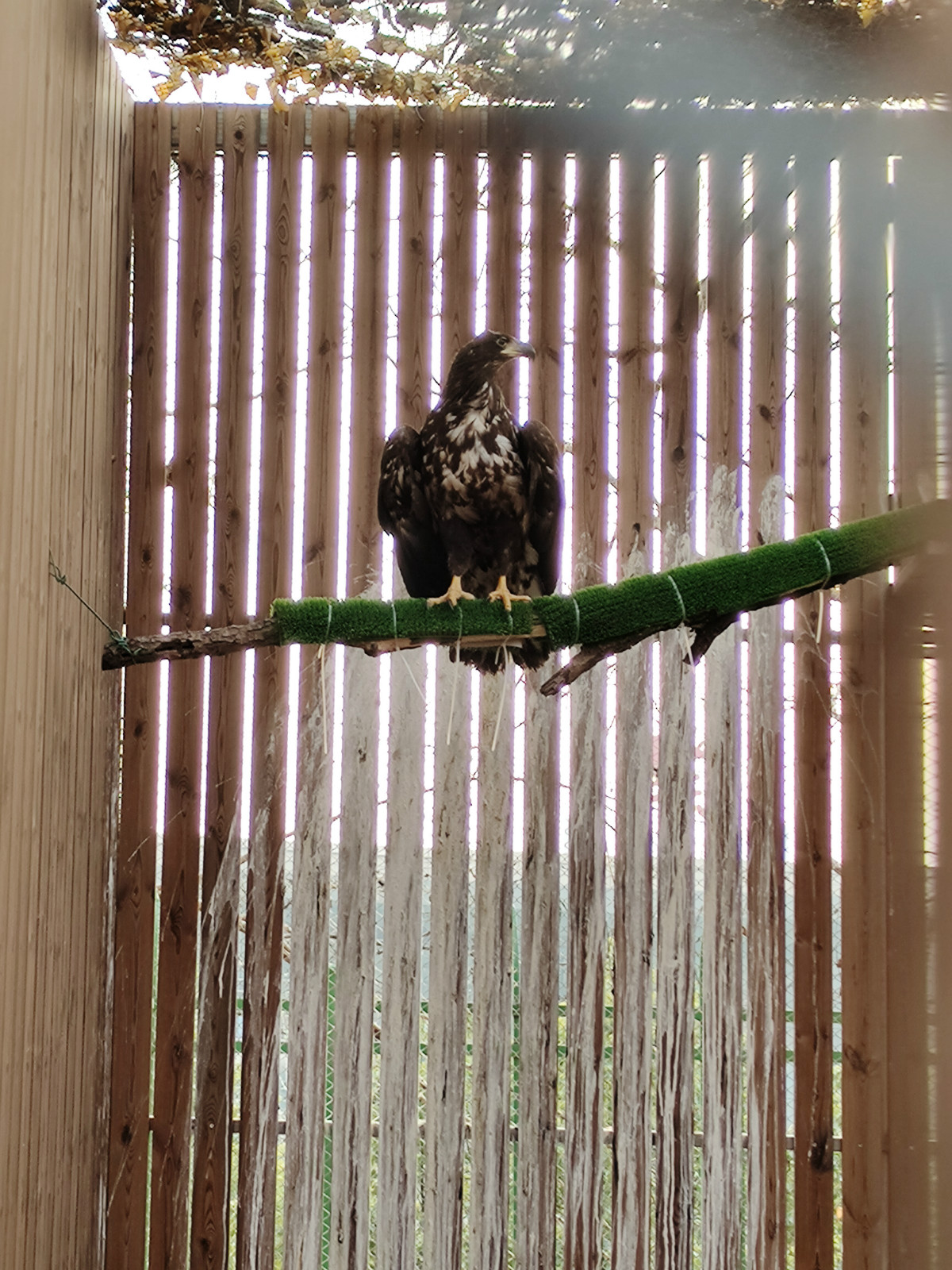 初期,白尾海雕采食正常,精神状态也还不错,中间突然开始“绝食”,兽医采取“补液 + 给予灌服刺激胃肠道运动的药物”的方法对其进行治疗,一周后,为白尾海雕进行人工填食,效果不错,白尾海雕开始自主采食,并能够飞行,行动正常。据救护人员介绍,这只白尾海雕非常机警,对人类保有很大戒心,几乎没有在救护人员眼前进行过采食。不过根据食物的剩量和它的粪便情况看,小家伙的体况还是不错的。对于如此野性的鸟儿来说,尽早放归才是最好的归宿。