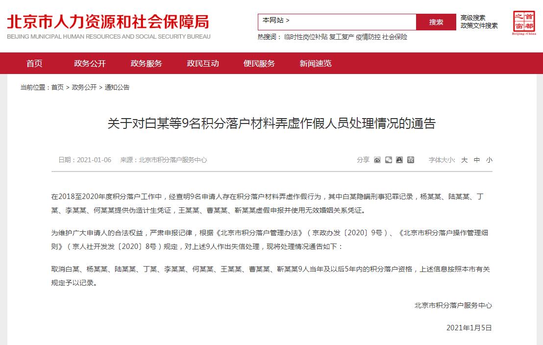 1月6日,北京市人力资源和社会保障局网站发布一则消息,白某等9名积分落户材料弄虚作假人员被处理。