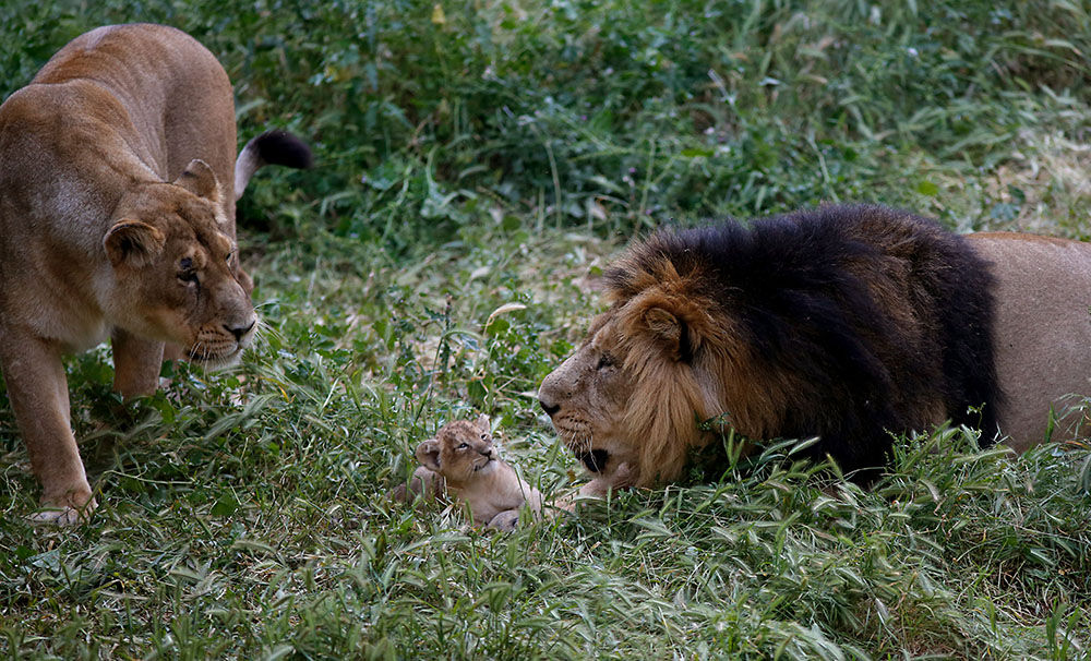 ↑2020年5月7日,在耶路撒冷的动物园内,一只亚洲狮宝宝和父母在一起。