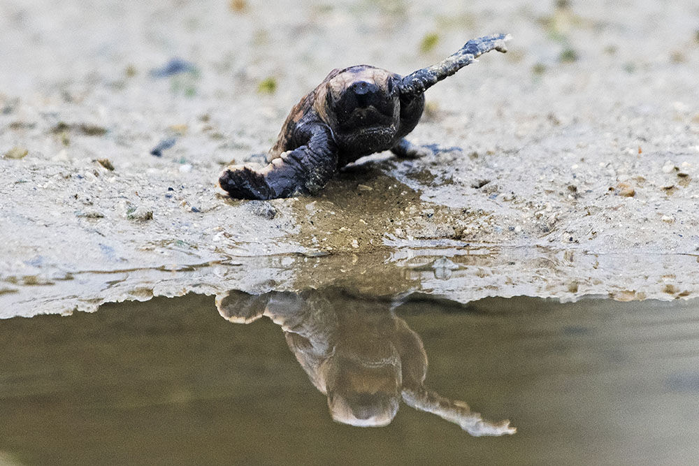 ↑2020年8月23日,在新加坡姐妹岛的海龟孵化场,一只新生小海龟爬向大海。