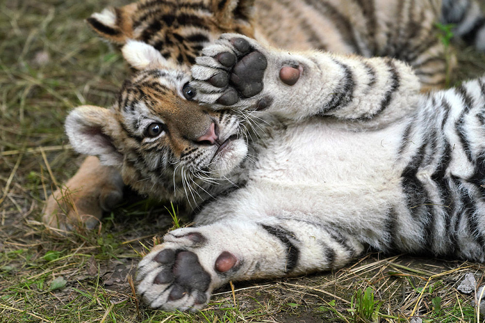 ↑2020年7月28日,在黑龙江省海林市横道河子东北虎林园的东北虎“幼儿园”,已有两个多月大的东北虎萌宝在玩闹。