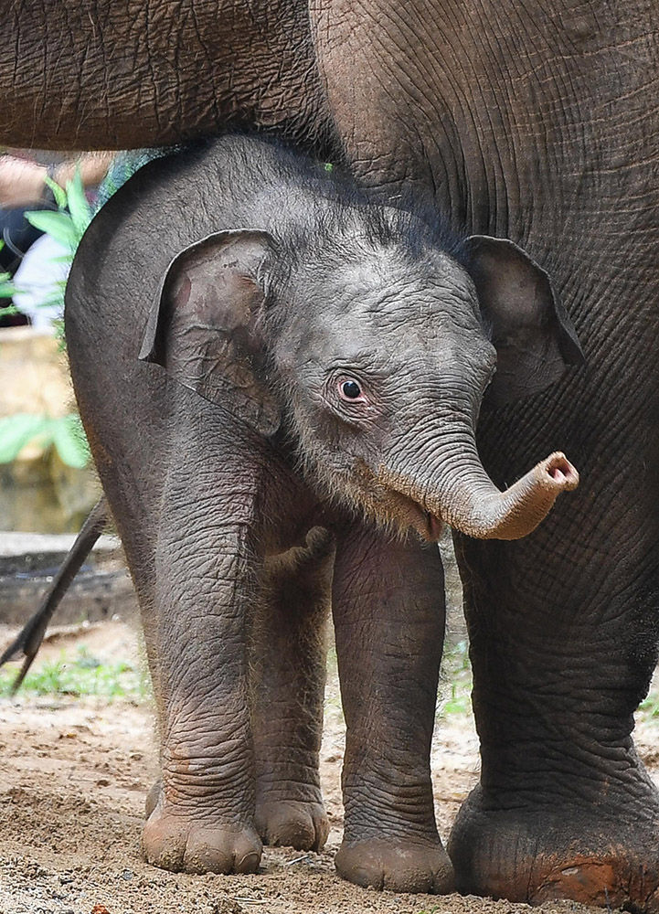 ↑2020年5月27日,广州长隆野生动物世界的新生亚洲象宝宝在妈妈身边玩耍。