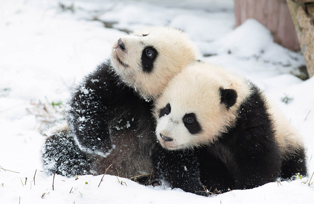 ↑2020年12月17日,两只大熊猫幼崽在中国大熊猫保护研究中心卧龙神树坪基地的雪地里嬉戏。