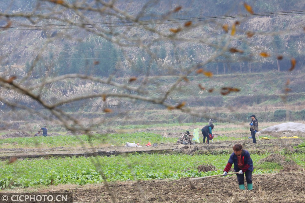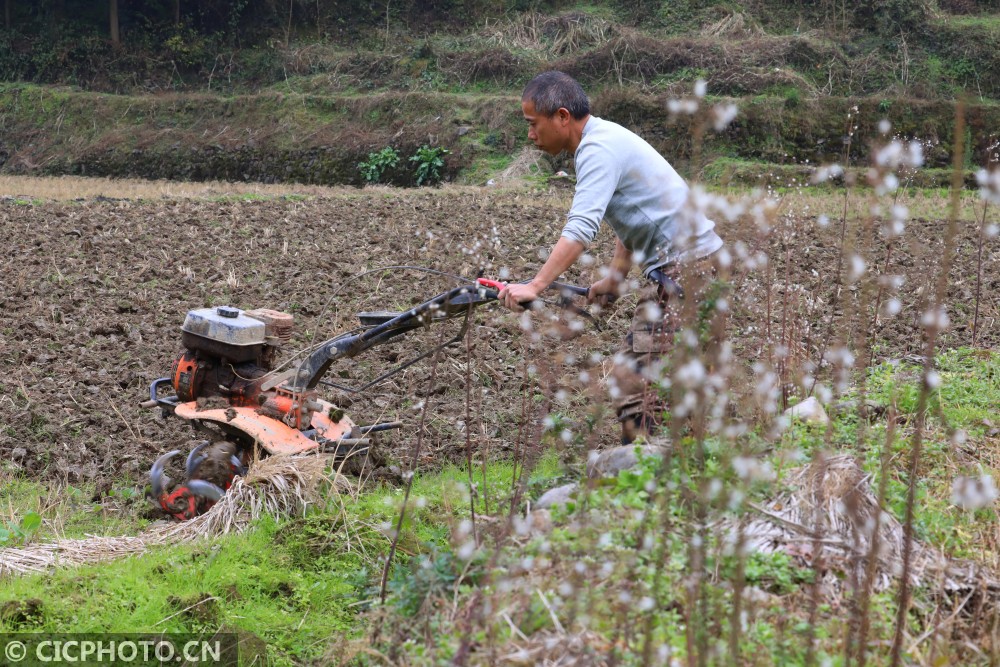 ↑2021年1月4日,湖南省湘西土家族苗族自治州吉首市乾州街道西门口村村民在田间翻耕土地。CICPHOTO/刘振军 摄