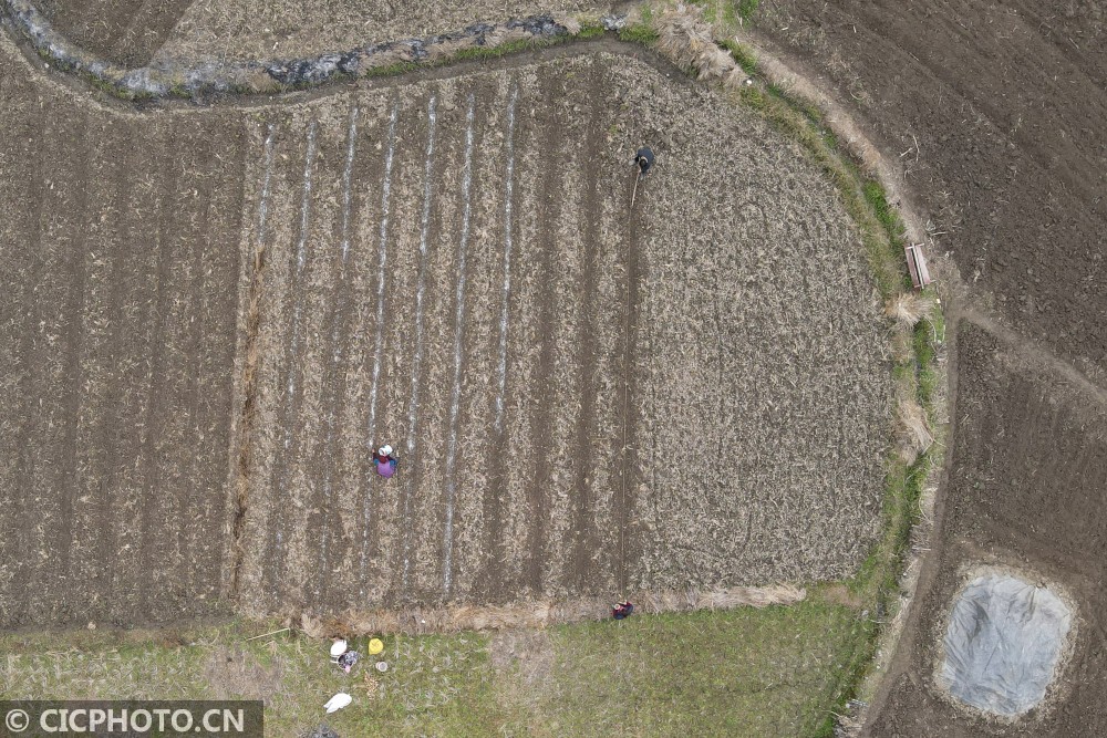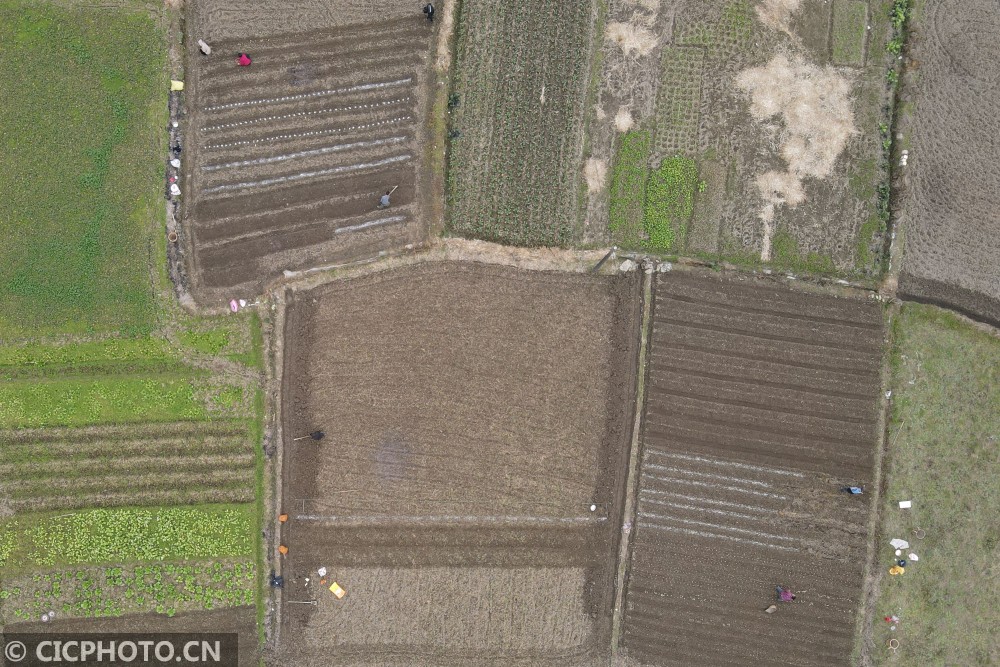 ↑2021年1月4日,湖南省湘西土家族苗族自治州吉首市乾州街道西门口村村民在田间种植马铃薯。(无人机拍摄)CICPHOTO/刘振军 摄