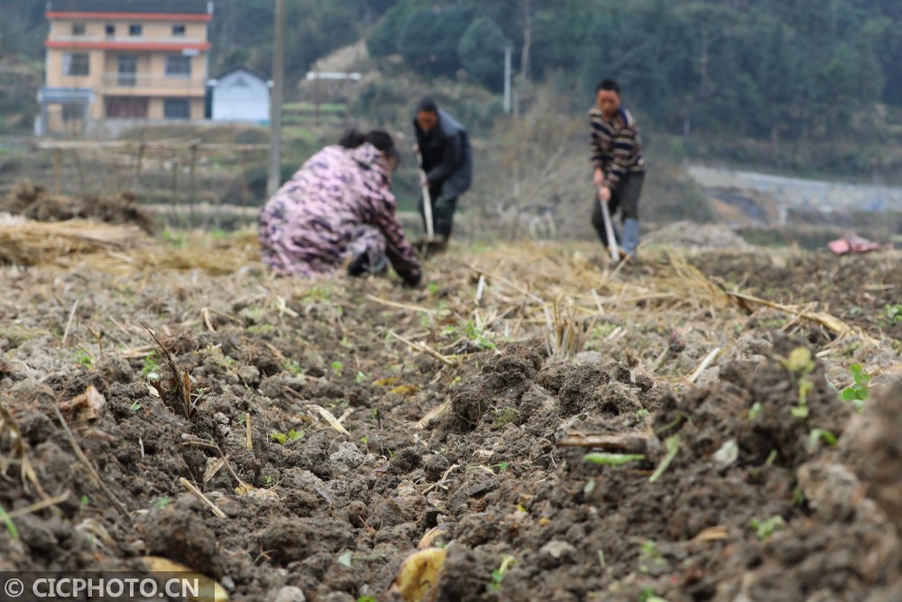 ↑2021年1月4日,湖南省湘西土家族苗族自治州吉首市乾州街道西门口村村民在田间种植马铃薯。CICPHOTO/刘振军 摄