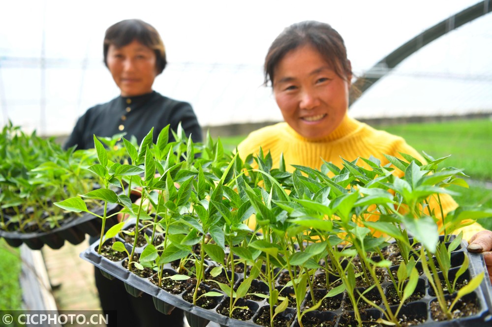 ↑2021年1月4日,安徽省亳州市谯城区张店乡一蔬菜种植合作社育苗大棚内,农民在管护辣椒苗。CICPHOTO/刘勤利 摄