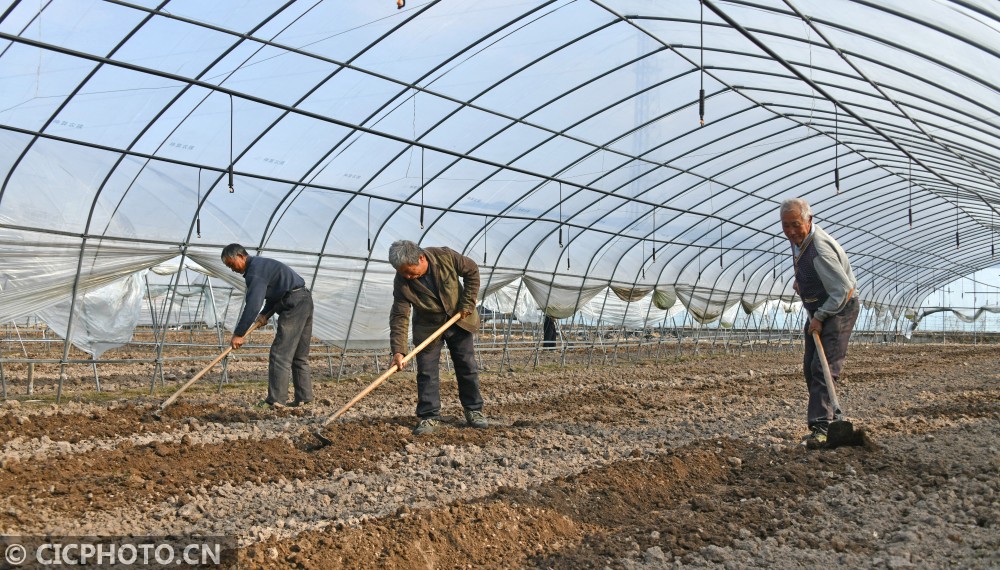 ↑2021年1月4日,浙江省台州市仙居县台湾农民创业园一生态育苗基地自动化育苗温棚内,农民在锄地松土、准备播种。CICPHOTO/王华斌 摄