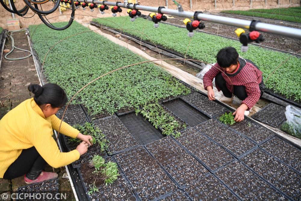 ↑2021年1月4日,安徽省亳州市谯城区张店乡一蔬菜种植合作社育苗大棚内,农民在移栽番茄苗。CICPHOTO/刘勤利 摄