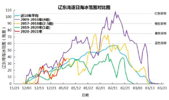 目前,渤、黄海冰情较近10年平均状况偏重,但未达到2009至2010年的严重程度。未来渤海冰情将稳定发展,1月中旬可能达到警报标准(60海里)。请持续关注国家海洋预报台发布的海冰信息。
