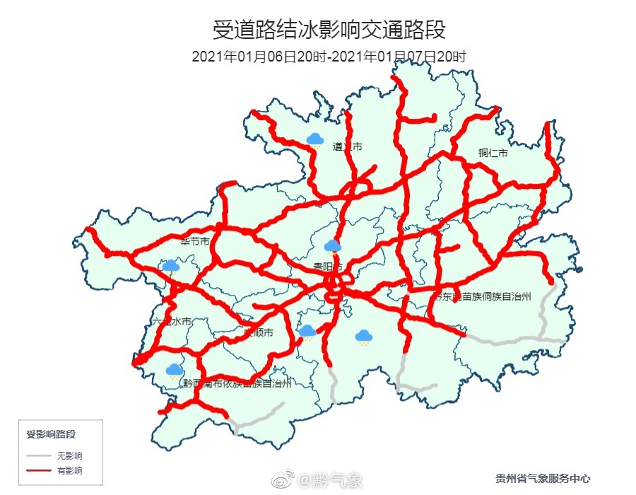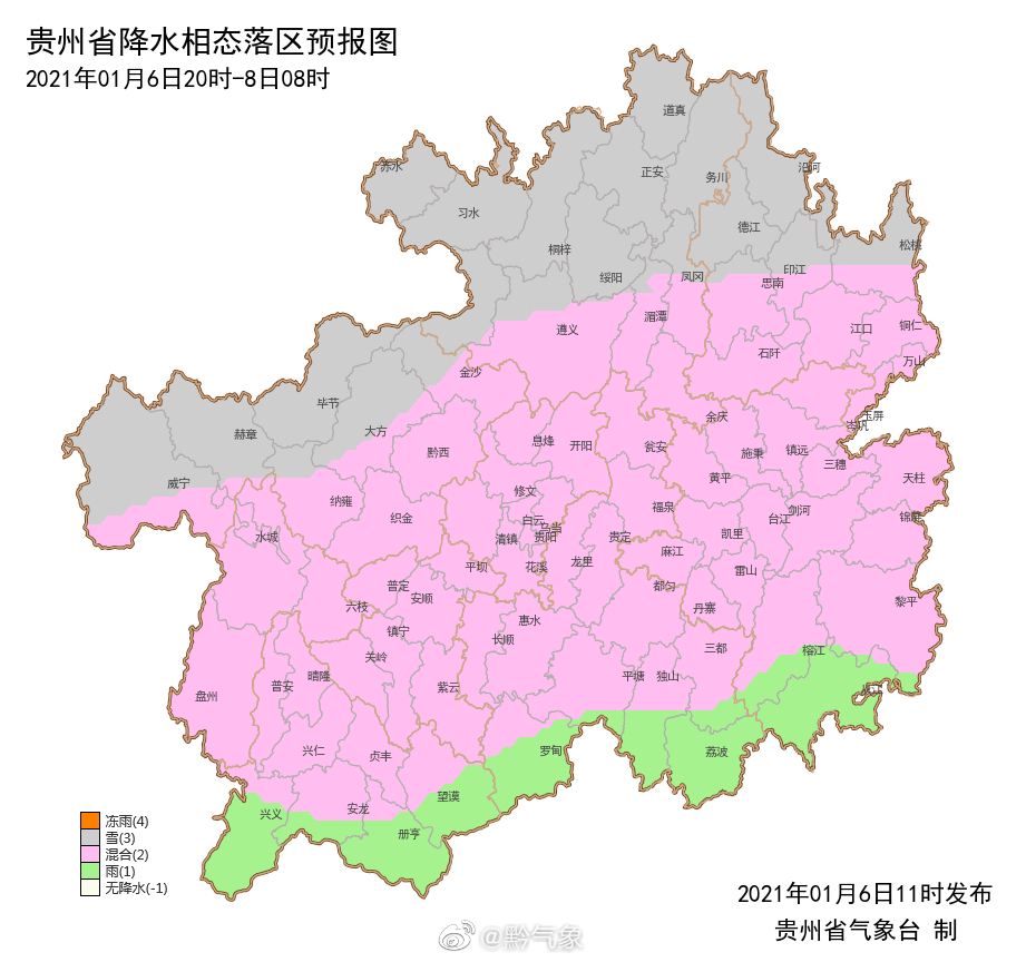 预计6日夜间到7日白天,贵州省南部边缘地区阴天有小雨,其余地区阴天有冻雨或雨夹雪并伴有道路结冰,北部地区局地有小雪。贵阳未来三天将维持低温雨雪凝冻天气,7日白天,贵阳中北部地区会飘些小雪,其余地区则以降雨为主。7日夜间将有望继续飘雪,预计为小雪量级。其间气温下降大(-5℃左右),夜间到早晨有雨雾,道路结冰范围扩大、增强。8日白天之后道路结冰情况会逐步减弱、缩小。