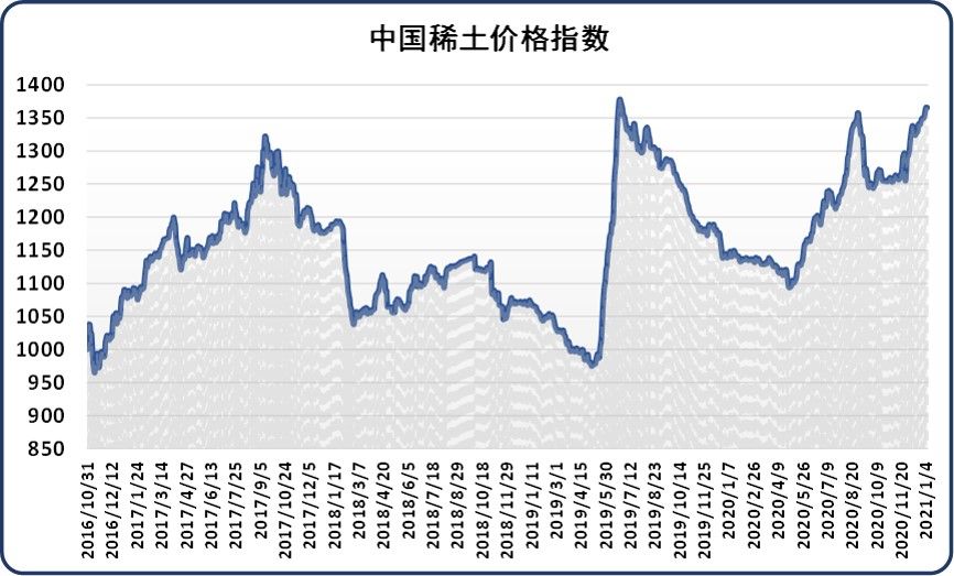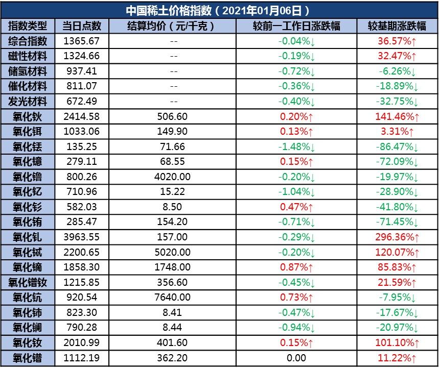 新华财经北京1月6日电(刘星麟)6日,中国稀土价格指数报1365.67点,较前一工作日下跌0.55点,跌幅为0.04%。氧化镨钕价格下调,上游厂家报价犹豫、观望后市,下游企业询单活跃度一般,且存在畏高情绪,采购成交不及预期。
