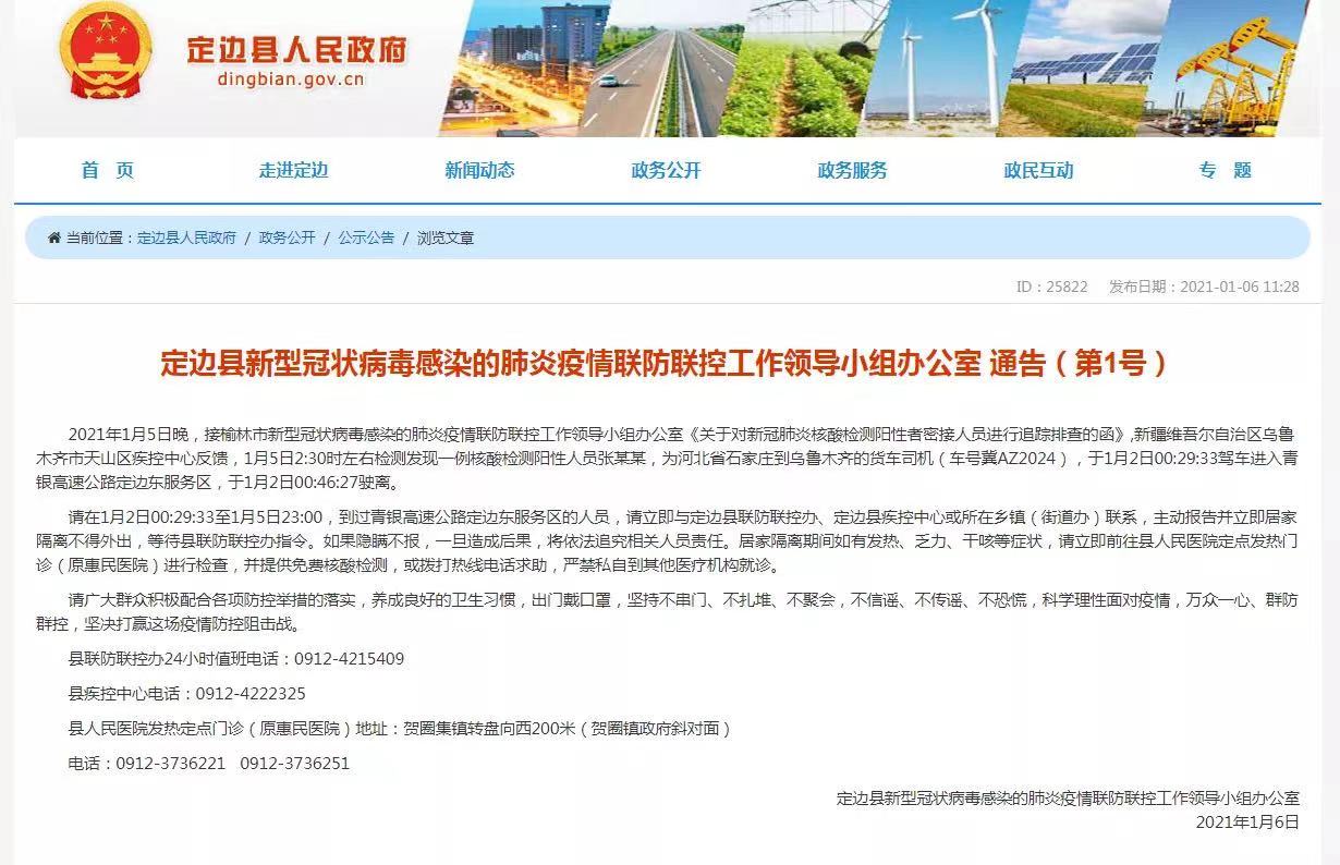 记者今天(6日)从陕西榆林定边县新型冠状病毒感染的肺炎疫情联防联控工作领导小组办公室了解到,新疆维吾尔自治区乌鲁木齐市天山区疾控中心反馈,1月5日2时20分左右,检测发现一例核酸检测阳性人员张某某,现在玛纳斯县隔离治疗,为河北省石家庄到乌鲁木齐的货车司机(车号冀AZ2024),于1月2日零时30分左右驾车进入青银高速公路定边东服务区,于1月2日零时46分驶离。