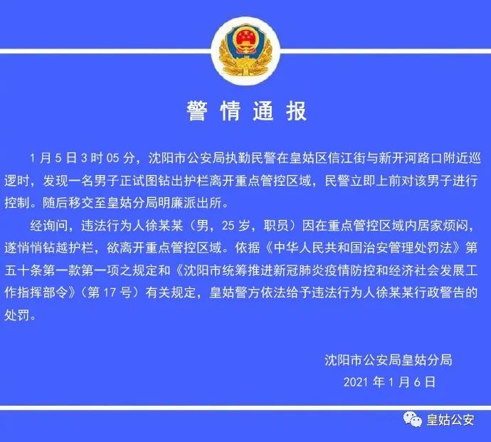 经询问,违法行为人徐某某(男,25岁,职员)因在重点管控区域内居家烦闷,遂悄悄钻越护栏,欲离开重点管控区域。依据《中华人民共和国治安管理处罚法》第五十条第一款第一项之规定和《沈阳市统筹推进新冠肺炎疫情防控和经济社会发展工作指挥部令》(第17号)有关规定,皇姑警方依法给予违法行为人徐某某行政警告的处罚。(总台央视记者 李承泽)