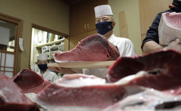 △2021年1月5日,在日本东京一家餐厅,工作人员将金枪鱼拍卖中拍获的鱼肉切开