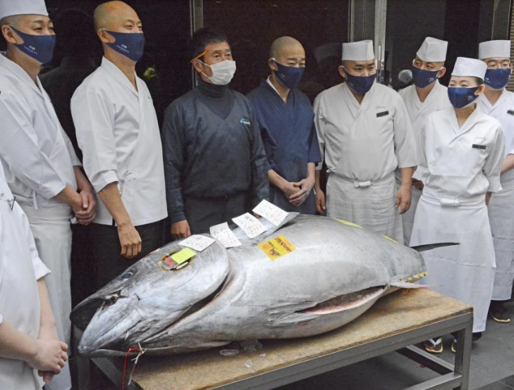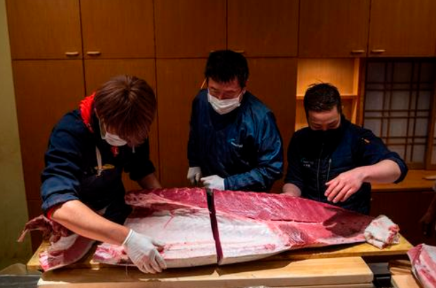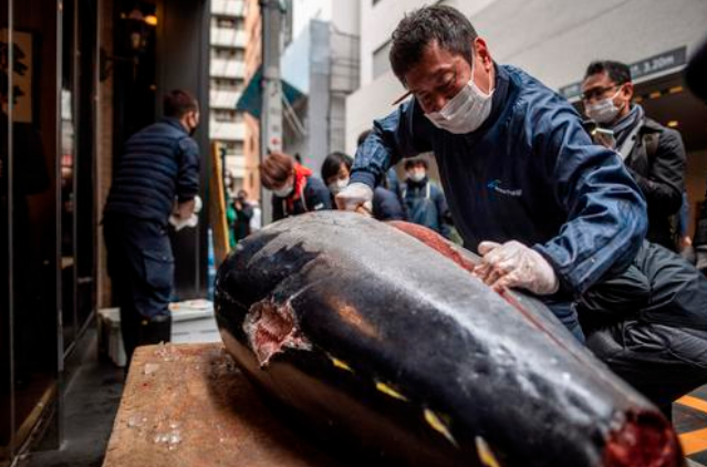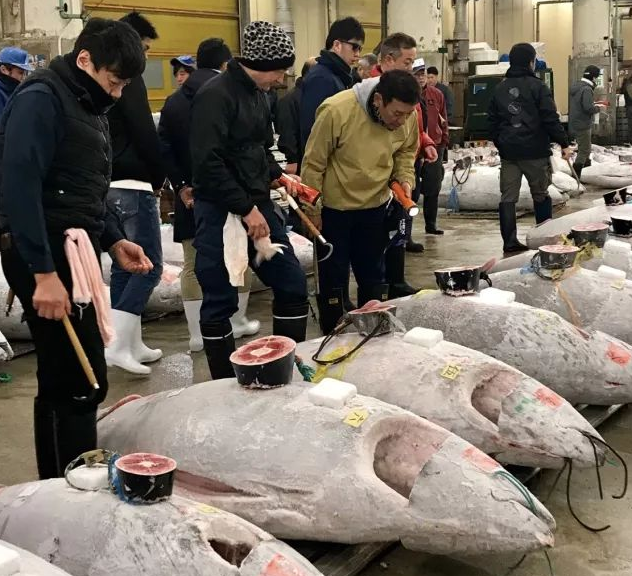 每年的新年拍卖会上,日本的各大寿司店主和供应商都抢着去拍卖新鲜的蓝鳍金枪鱼,拍卖下来之后就会现场切割并售卖。